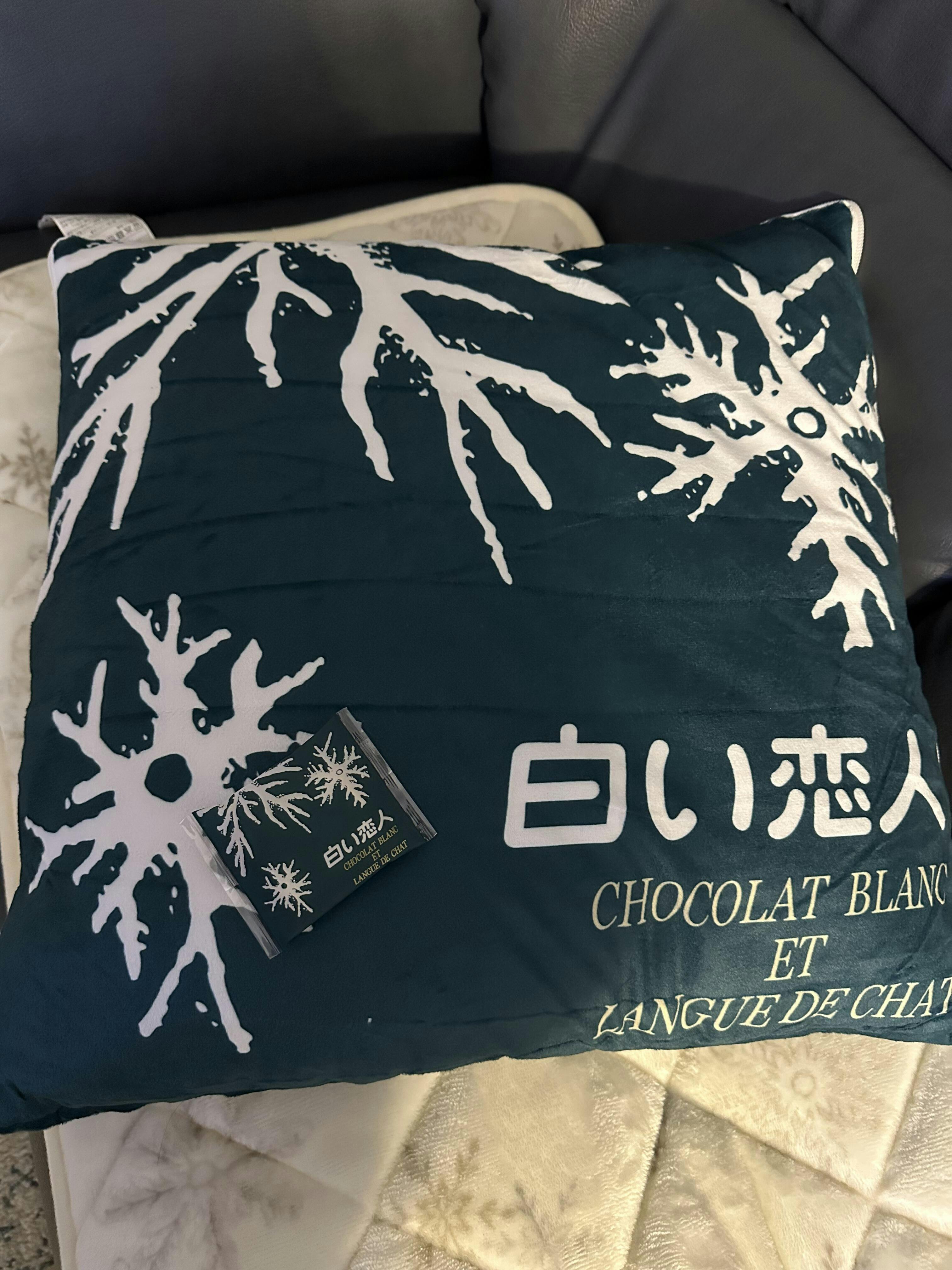 白い恋人のオリジナルリバーシブルクッション。表側は白い恋人の個包装デザイン、内側はラング・ド・シャのデザインとなっています。北海道お土産としてはもちろん、ご自宅用にもおすすめの商品です。